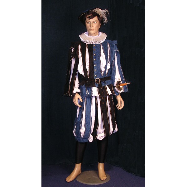 Pantalon alcantara galonné et crèpe, Pourpoint alcantara galonné et crèpe, Fraise crin et satin, Calot alcantara et plume, Accessoire : baudrier alcantara, Bas lycra coton